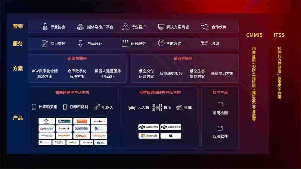 聚合国内外先进的物联网硬件产品品牌,,,,聚焦数字化仓储、、、、机器人运营、、、、低空智联网等领域,,,,共同打造适合客户业务场景的解决方案并提供交付服务
