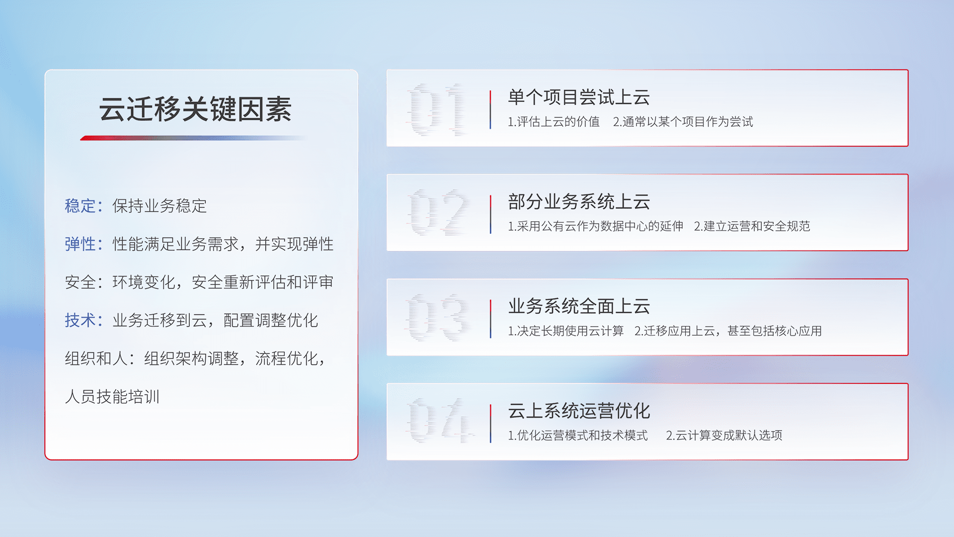 结合实际业务,,,,从规划设计、、云平台选型、、、、云原生改造、、数据迁移、、、、集成交付,,,迁移全过程为客户识别最佳上云路径,,做好风险识别管理,,,,设计网络架构、、、、身份权限、、、、安全审计合规、、、操作审计、、、日志审计、、监控告警策略、、多站点容灾设计等,,,对云上基础设施进行整体规划,,,提升IT治理水平,,,以满足弹性、、、、高可用、、高性能的需求。。。。